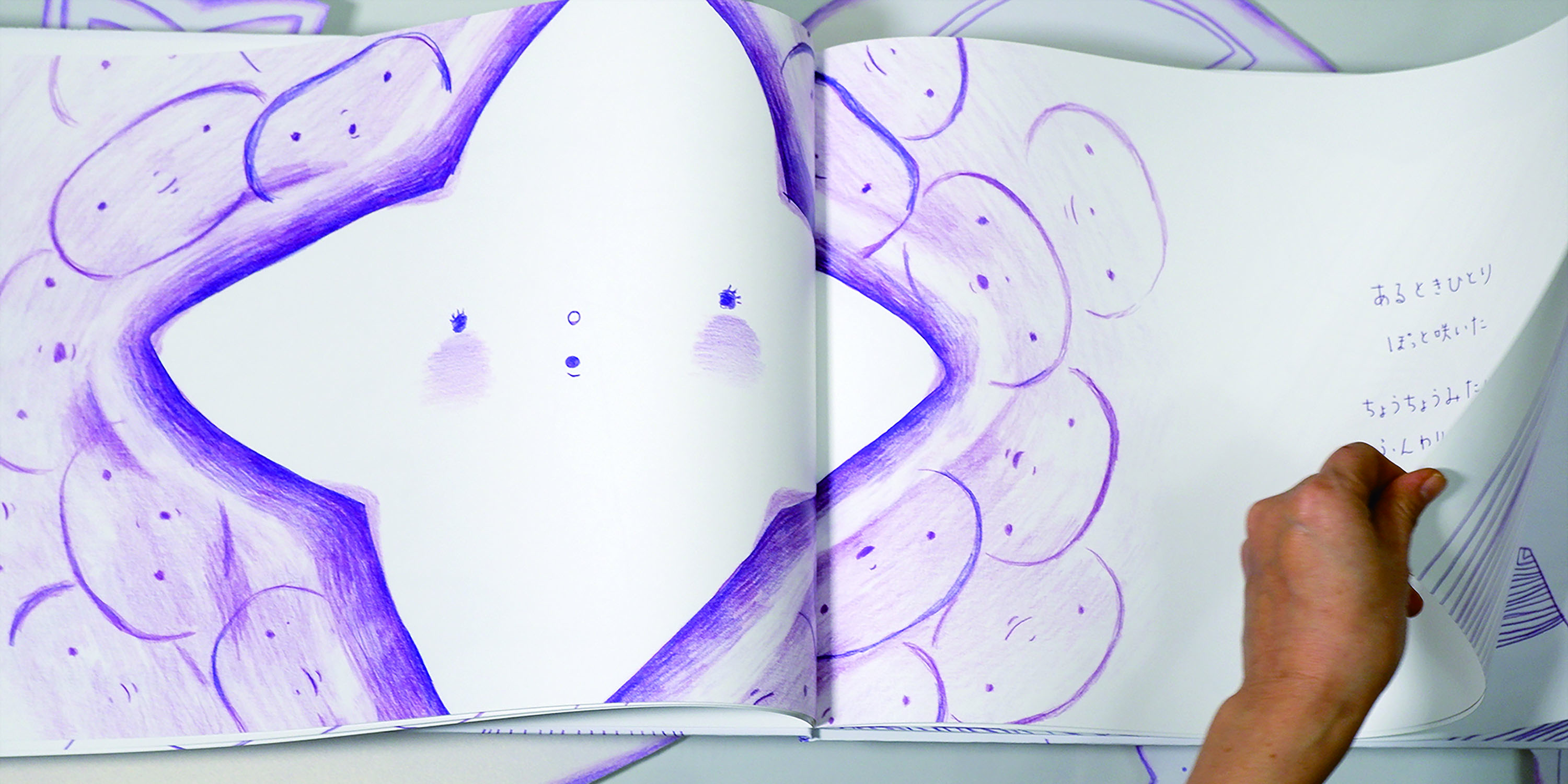 読んだ後に、これまでの自分もこれからの自分のことも認められるような、そんな作品を目指した一冊です。私たちは変わっていないように見えても自分の中での葛藤と、周囲から与えられることによって少しずつ変化しています。あどけないつぼみがどう変化していくのか。絵本を読む台も共にデザインし、物語をより楽しめる空間を作りました。
