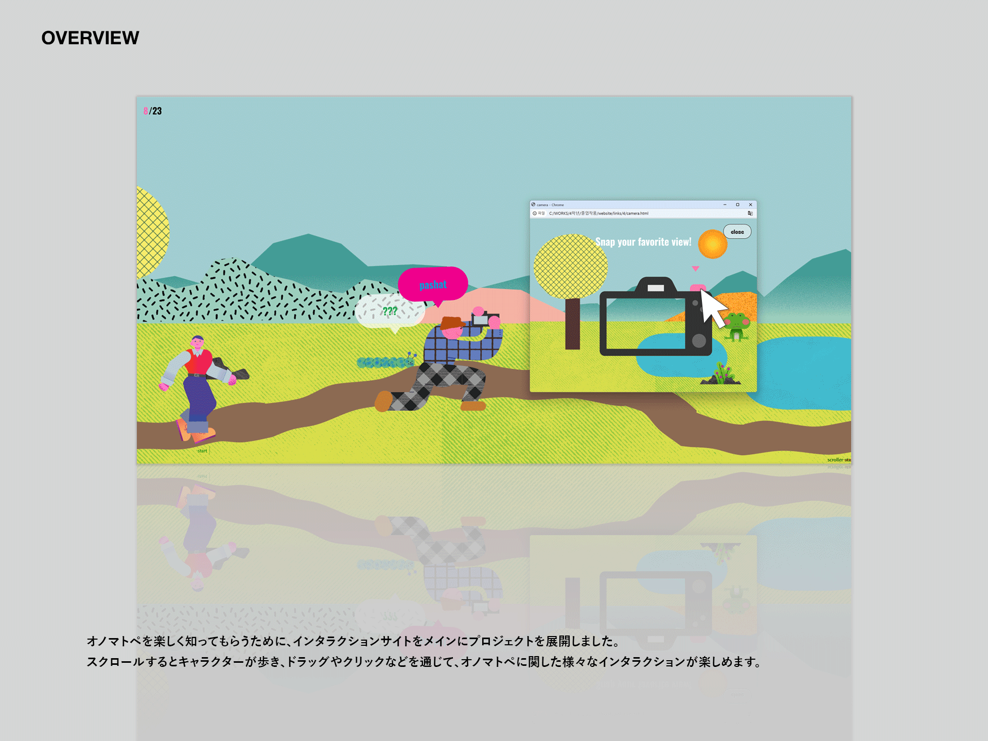 ドキドキ、シャカシャカ、ゴロゴロ! 日本のオノマトペは、響きが可愛らしく、発音もしやすい特徴があります。既にumami のような単語が海外に定着しているように、オノマトペも世界へ広がっていけるのではな いでしょうか。 『Let’s ONOMATOPE!』では、ウェブサイトや押すと音が鳴るぬいぐるみを通して、 遊び心地のあるインタラクションでオノマトペを楽しく体験し、知ることができます。 それでは、みんなでLet’s ONOMATOPE!