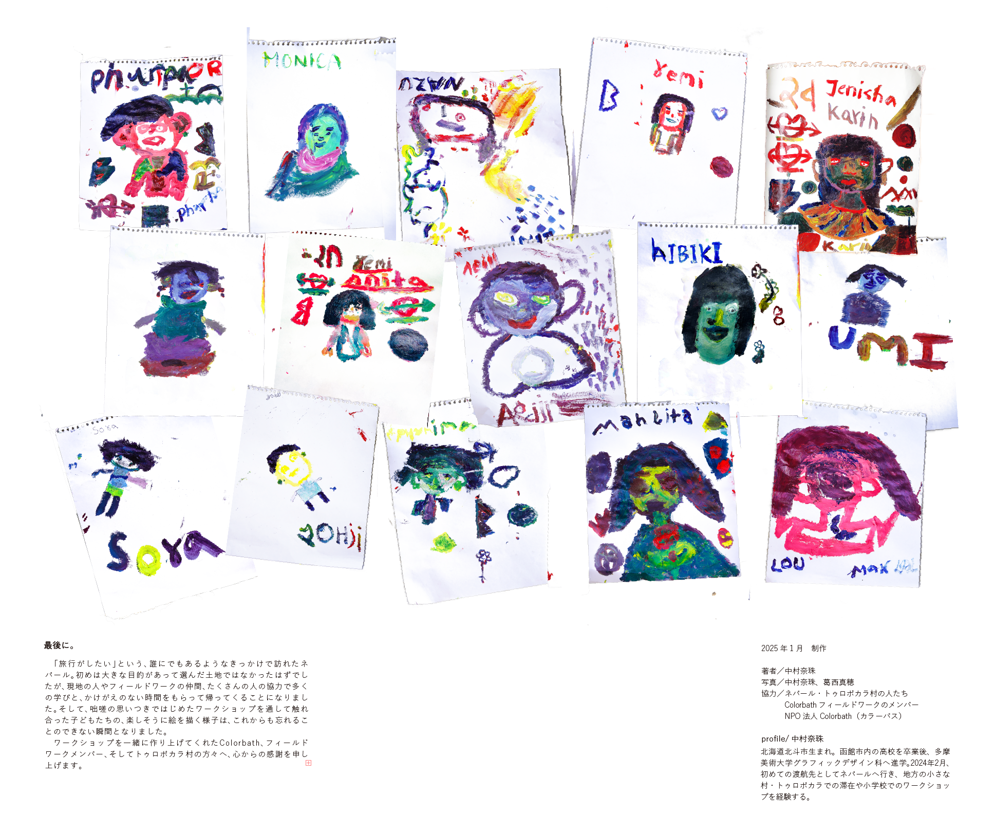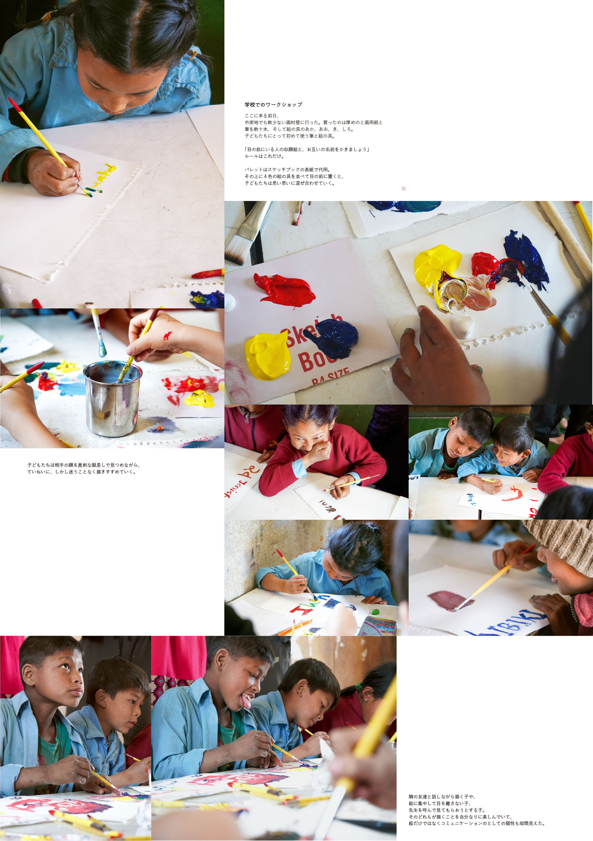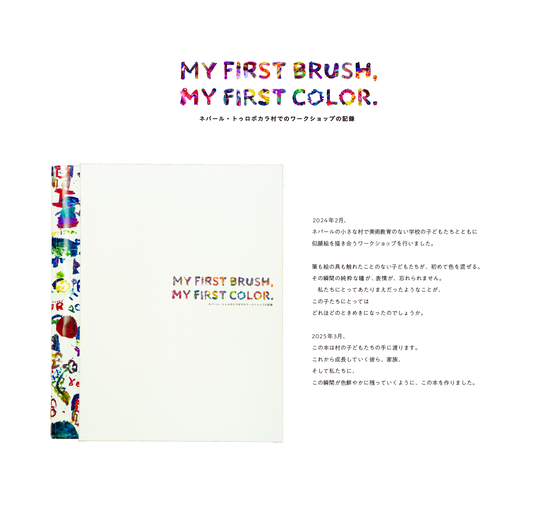2024年2月、ネパールの小さな村で美術教育のない学校の子どもたちと似顔絵を描き合うワークショップを行いました。初めての筆と絵の具を手に持ち、色を混ぜる子どもたち。その瞬間の純粋な瞳が、表情が、忘れられません。私たちにとってあたりまえだったようなことが、この子たちにとってはどれほどのときめきになったのでしょうか。 2025年3月、この本は村の子どもたちの手に渡ります。これから成長していく彼ら、家族、そして私たちに、この瞬間が色鮮やかに残っていくように、この本を作りました。