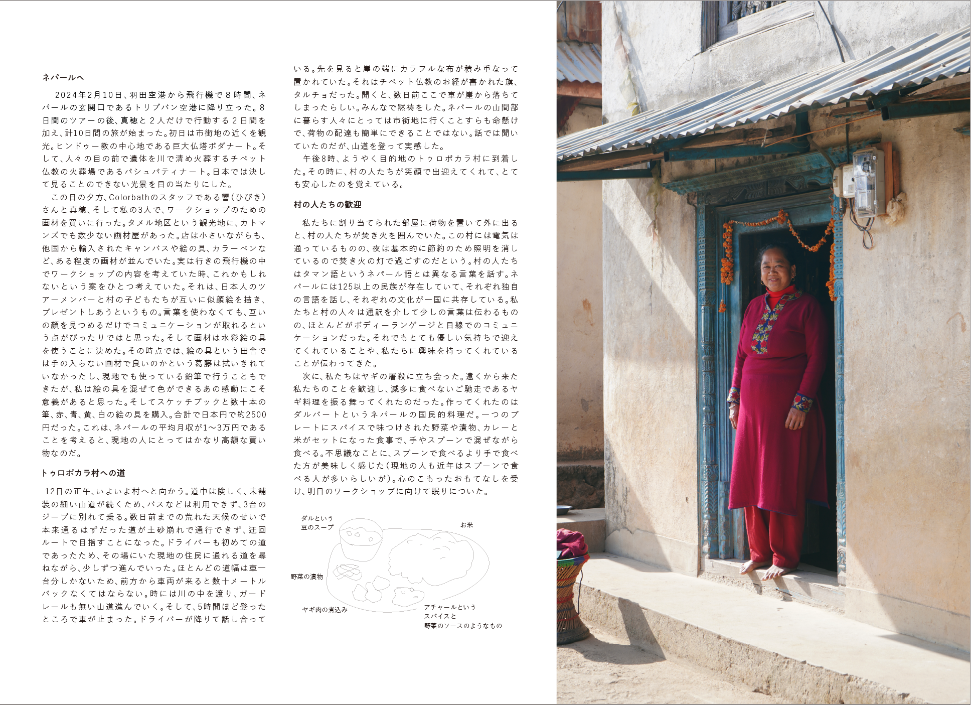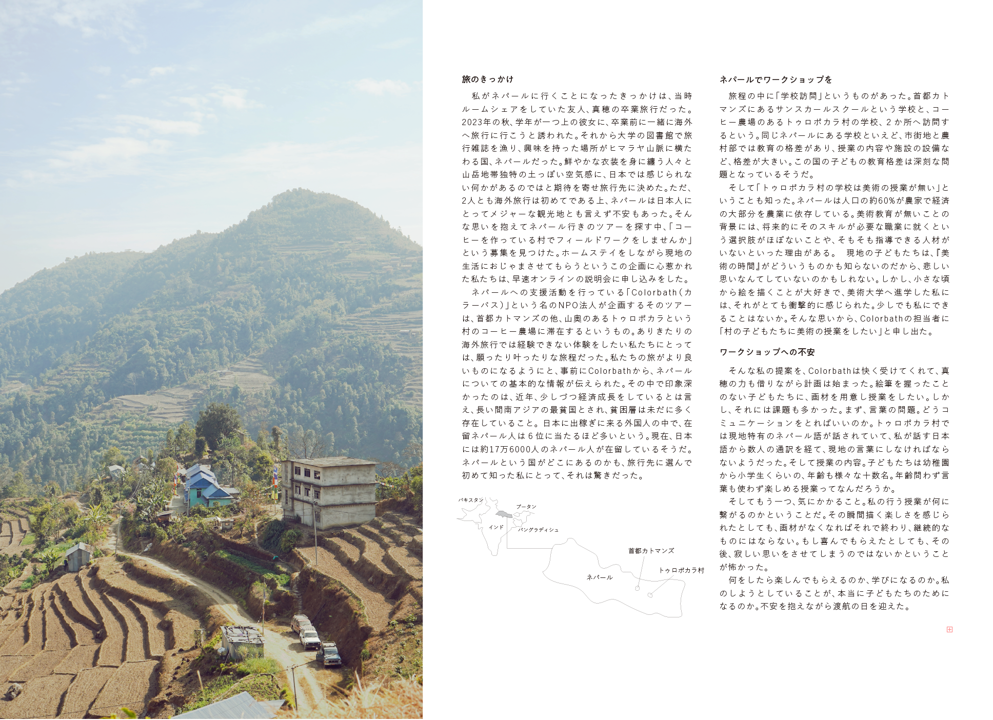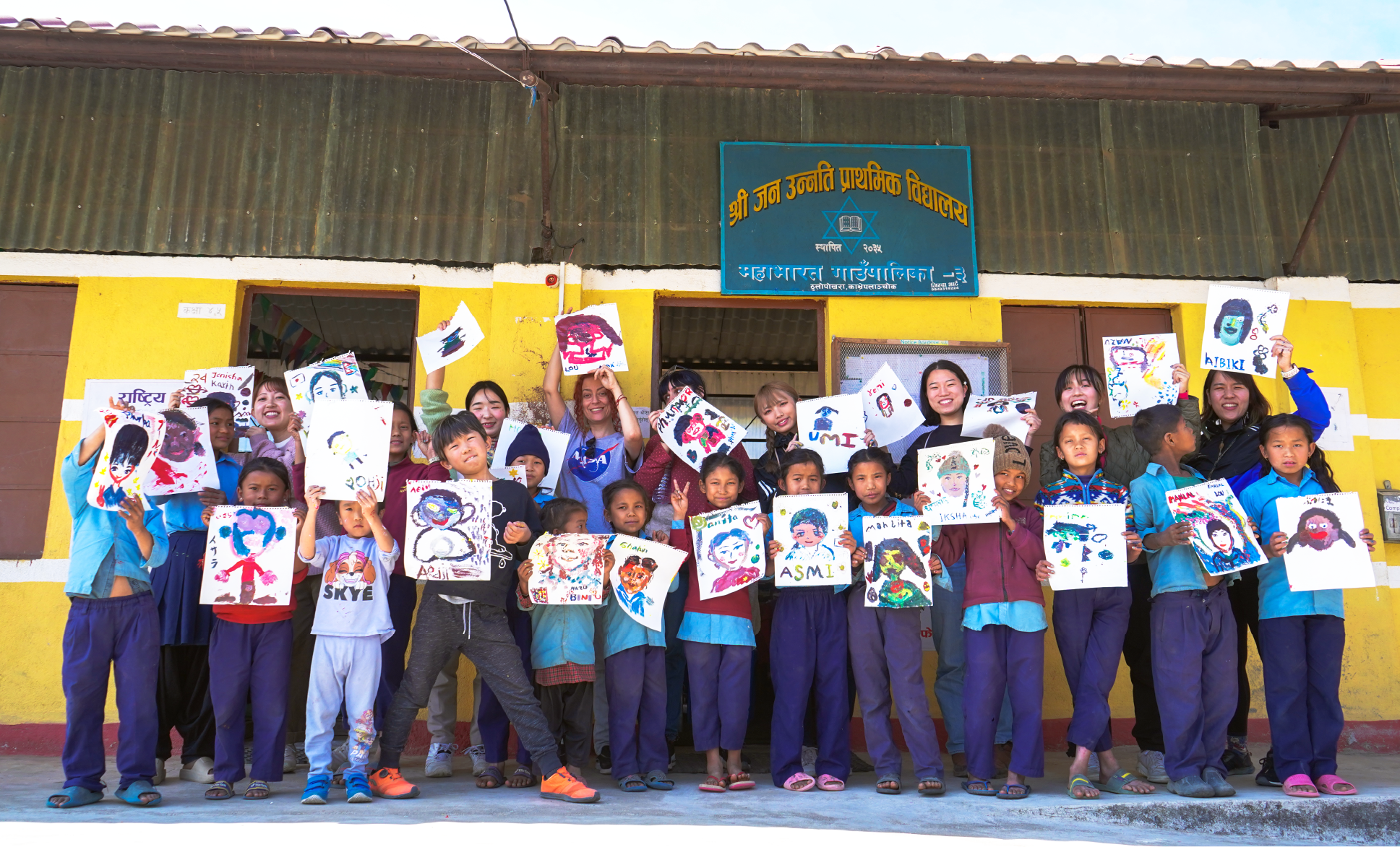 2024年2月、ネパールの小さな村で美術教育のない学校の子どもたちと似顔絵を描き合うワークショップを行いました。初めての筆と絵の具を手に持ち、色を混ぜる子どもたち。その瞬間の純粋な瞳が、表情が、忘れられません。私たちにとってあたりまえだったようなことが、この子たちにとってはどれほどのときめきになったのでしょうか。 2025年3月、この本は村の子どもたちの手に渡ります。これから成長していく彼ら、家族、そして私たちに、この瞬間が色鮮やかに残っていくように、この本を作りました。
